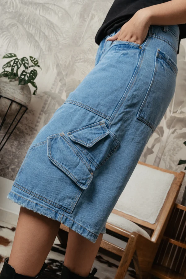 Jort en tela denim azul, con dos bolsillos traseros (uno de ellos con bordado) y bolsillos laterales funcionales. Largo por debajo de la rodilla y silueta relajada