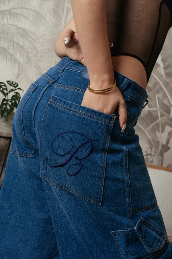 Jort en tela denim azul, con dos bolsillos traseros (uno de ellos con bordado) y bolsillos laterales funcionales. Largo por debajo de la rodilla y silueta relajada